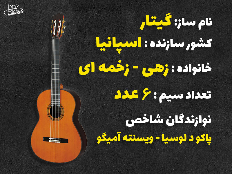 این ساز هم مثل بقیه ساز های این خانواده از چوب درختان برای ساخت بدنه و دسته و همچنین سیم های پلاستیکی و فلزی ساخته میشه. گیتار ها معمولا به سه دسته ی معمول گیتار کلاسیک ، گیتار آکوستیک ، گیتار الکتریک و گیتار بیس تقسیم بندی میشن.
